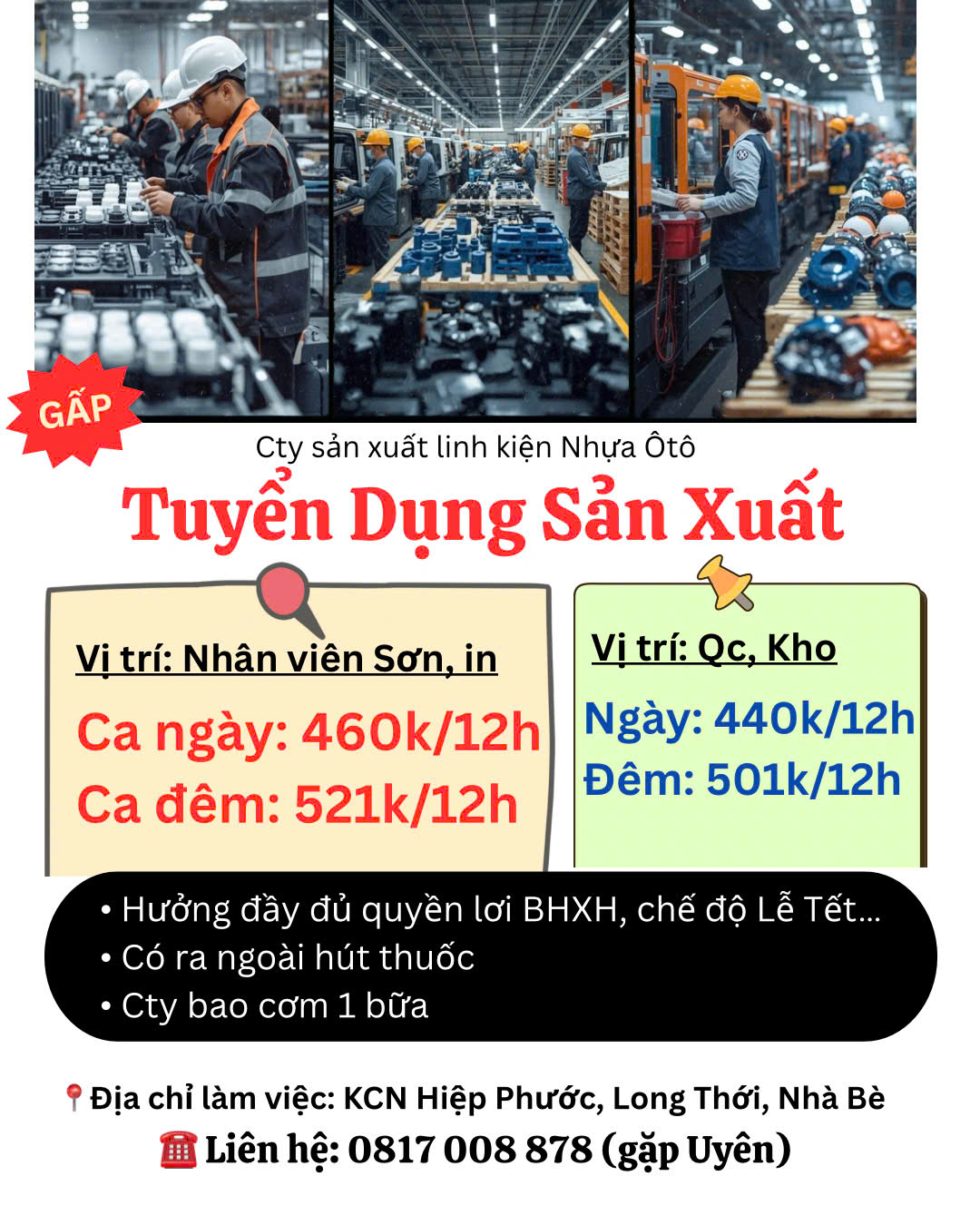 - Sản xuất linh kiện nhựa ô tô, công việc không cần kinh nghiệm, chỉ cần tăng ca được.
